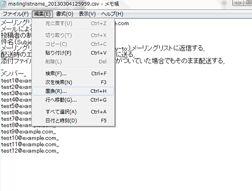 - バックアップサーバーからダウンロードしたメーリングリストのバックアップファイルをnotepadなどのテキストエディタで開いてください。