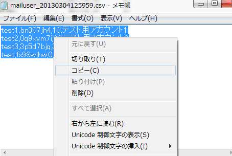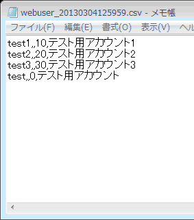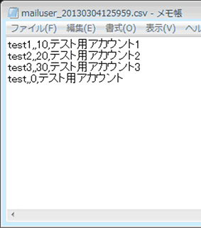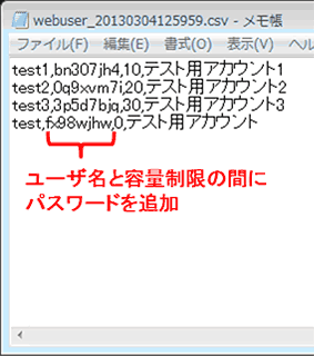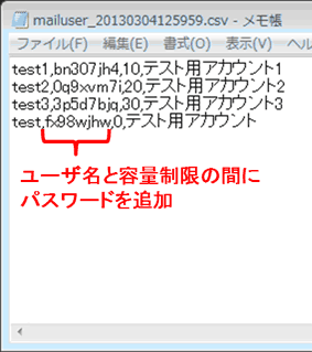以下画像は、左側からアカウント、パスワード、容量制限、コメント、の順にカンマ区切りで記述した例となります。