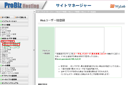 - サーバーのサイトマネージャーへアクセスし、[Webユーザー管理]→[Webユーザー一括追加]へ進みます。