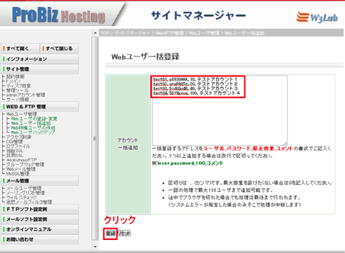 - Webユーザー一括登録欄に貼り付け、 画面下の[登録]ボタンをクリックします。