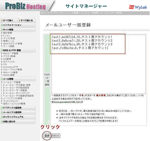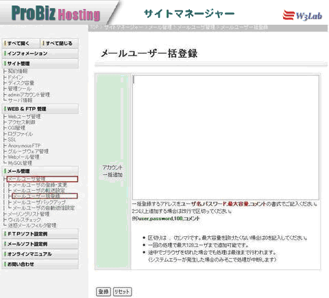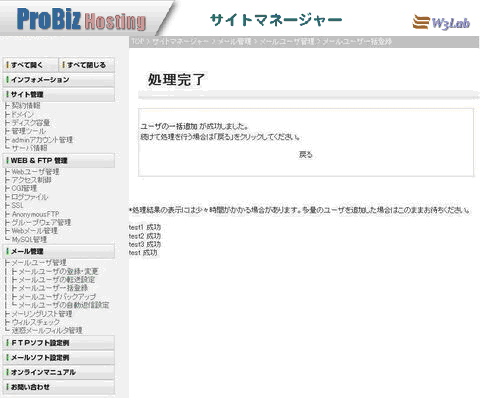 Mailユーザーのバックアップデータを利用して、W3LabProBiz サイトマネージャー上でユーザー情報を再設定することができます。