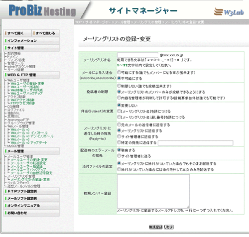 - サイトマネージャーへアクセスし、[メール管理]→[メーリングリスト管理]→[メーリングリストの登録・変更]へ進みます。