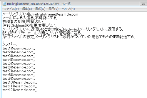 ※ファイル名は、メーリングリスト名_ yyyymmddhhmmss.csvです。