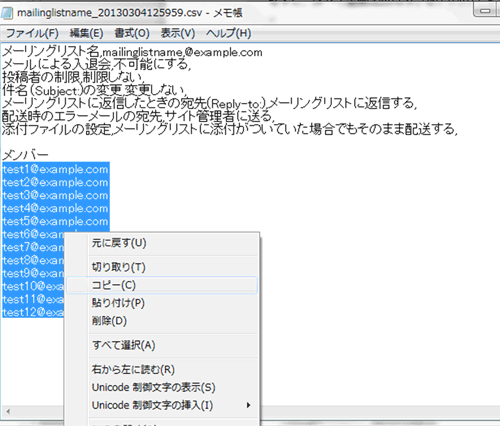 - バックアップサーバーからダウンロードしたメーリングリストのバックアップファイルをnotepadなどのテキストエディタで開いてください。