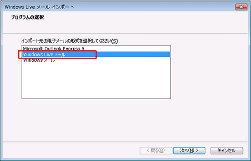 インポート元の電子メールの形式は「Windows Liveメールインポート」を選択して[次へ(N)>]をクリックします。
