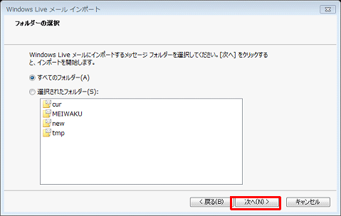 [OK]をクリックすると「Windows Liveメールインポート」ダイアログに戻るので、[次へ(N)>]をクリックします。