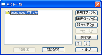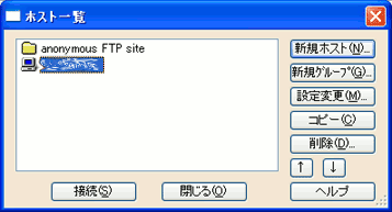 - FFFTPを起動します。ホスト一覧画面が開きますので、「新規ホスト」ボタンをクリックします。