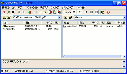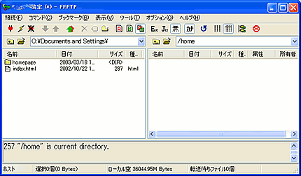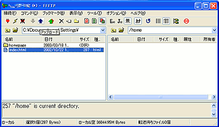 画面左側のローカルフォルダ側はアップロードするファイル一覧を表示させます。画面右側のホストフォルダ側は 「home」ディレクトリをダブルクリックし 「home」ディレクトリ内に入ります。