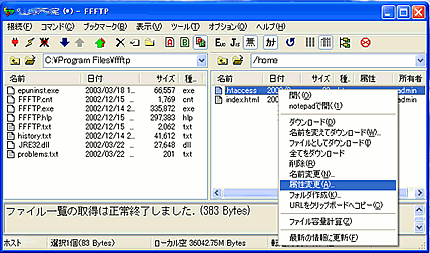 - FFFTPを起動します。サーバーに接続します。パーミッションを変更したいファイルを選択し、右クリックして「属性変更」をクリックします。