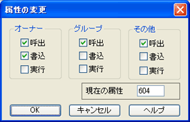 - 属性の変更 画面が表示されます。現在の属性 で変更したいパーミッションの数値を入れ、「OK」ボタンをクリックします。パーミッションにつきましては、ファイル転送 - パーミッションをご参照下さい。