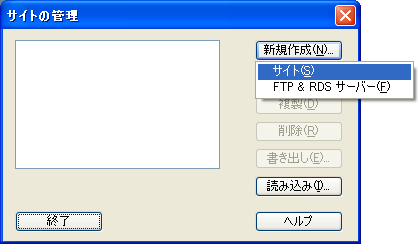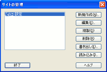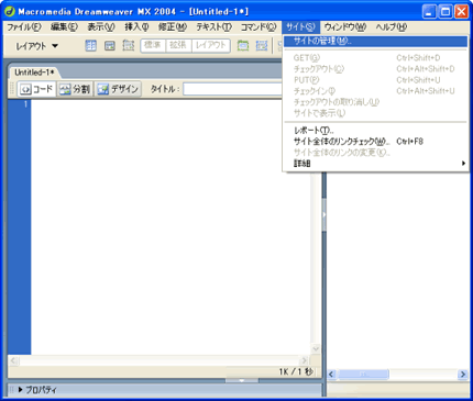 - Dreamweaverを起動します。メニューバーの「サイト」→「サイトの管理」をクリックします。