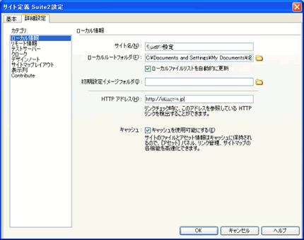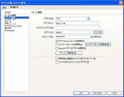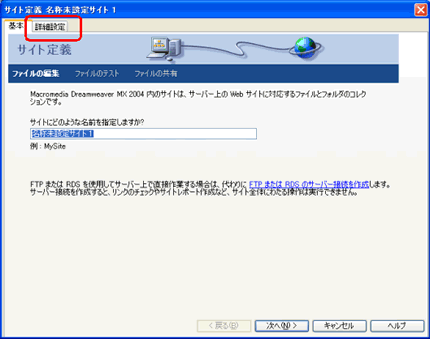 - サイト定義画面が開きます。この画面では何も設定せずに、「詳細設定」タブをクリックします。