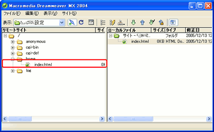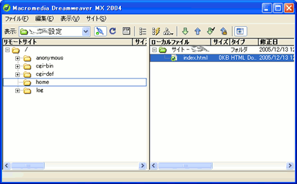- トップページとなるindexファイルをアップロードする場合は、次のように操作を行います。 画面右側のローカルフォルダ側はアップロードするファイル一覧を表示させます。 画面左側のホストフォルダ側は「home」ディレクトリをダブルクリックし「home」ディレクトリ内に入ります。