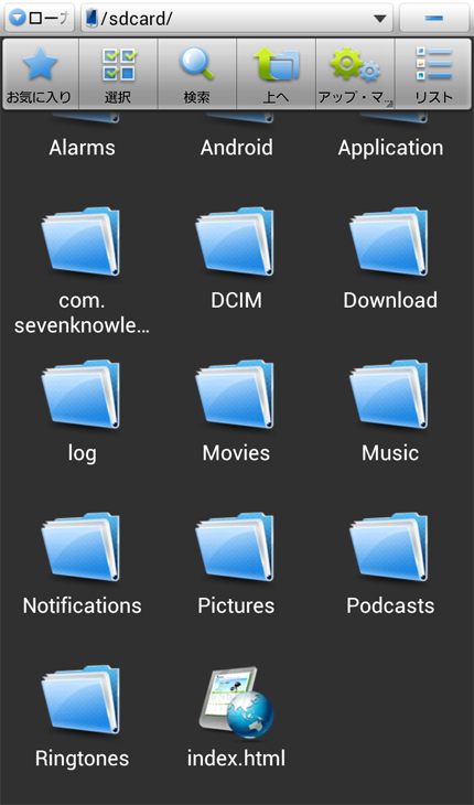 アップロードさせたいファイルの置き場へ移動し(ここではローカルフォルダに保存してあるindexファイルを対象とします)左上のタブから「ローカル」を選択し、index.htmlファイルを長押しします。