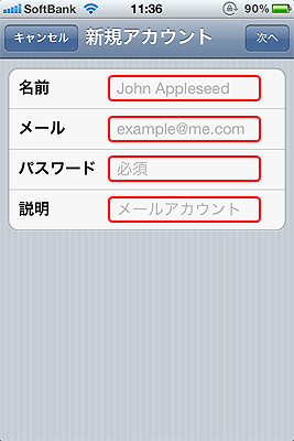 - アカウント情報を入力し、「次へ」をタップします。