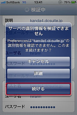 ホスト名 お客さまのドメイン名 or IPアドレス ユーザ名 受信したいメールのアカウント名 パスワード メールのパスワード - 「次へ」をクリックすると、以下のメッセージ画面が表示されますので、「続ける」をタップしてください。