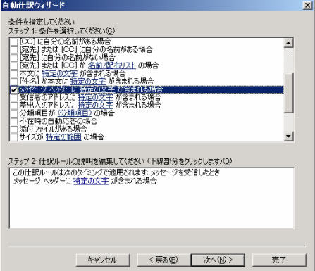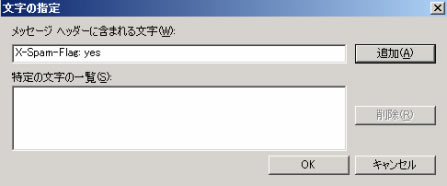 文字の指定画面から、メッセージヘッダーに含まれる文字の項目に、「X-Spam-Flag: yes」と記入し、「追加」をクリックし、「OK」をクリックします。条件の指定画面に戻りましたら、「次へ」をクリックします。