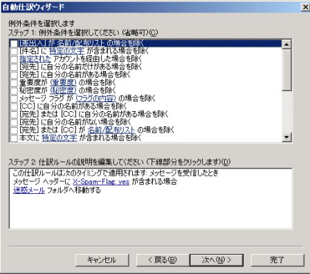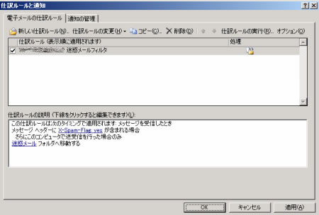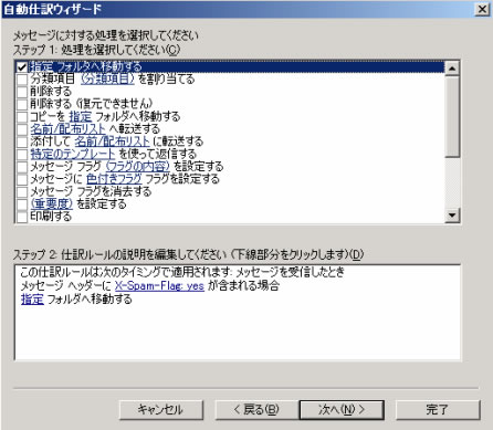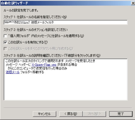 - 仕訳ルールの条件 : メッセージ ヘッダーに「X-Spam-Flag: yes」が含まれている場合