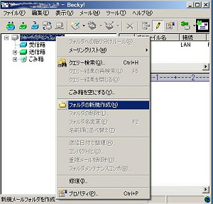 Becky! を起動し、受信箱を選択後、右クリックし、「フォルダの新規作成」を選択してください。ここではspamという名前のフォルダを作成します。