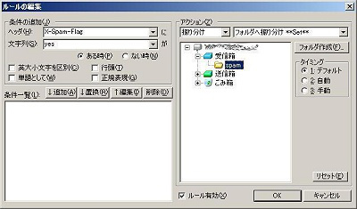 - ルールの条件 : ヘッダに「X-Spam-Flag: yes」が含まれる場合
