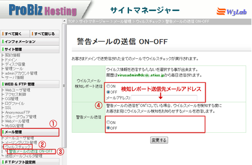 サイトマネージャーの「メール管理」→「ウイルスチェック」→「警告メールの送信 ON-OFF」から行ってください。